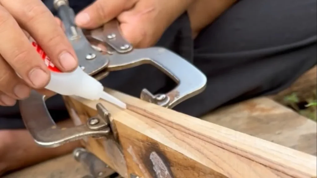 3.หยอดกาวลงในบริเวณที่ต้องการ แล้วจึงค่อยปรับให้แคลมป์ให้บีบตัวจนไม้ประกบกันได้สนิทแล้วทิ้งไว้ประมาณ 1 – 2 นาที จึงคลายแคลมป์