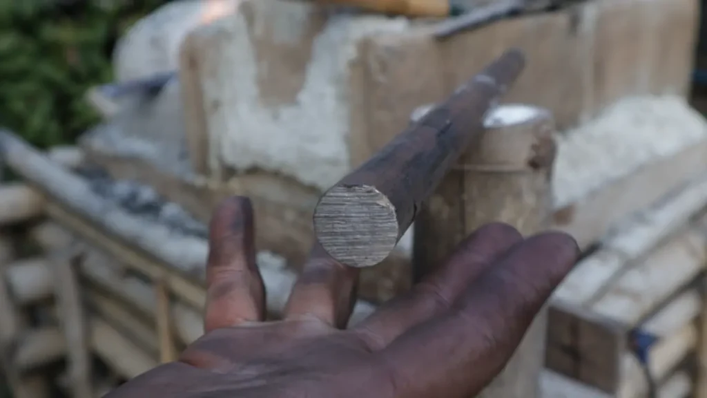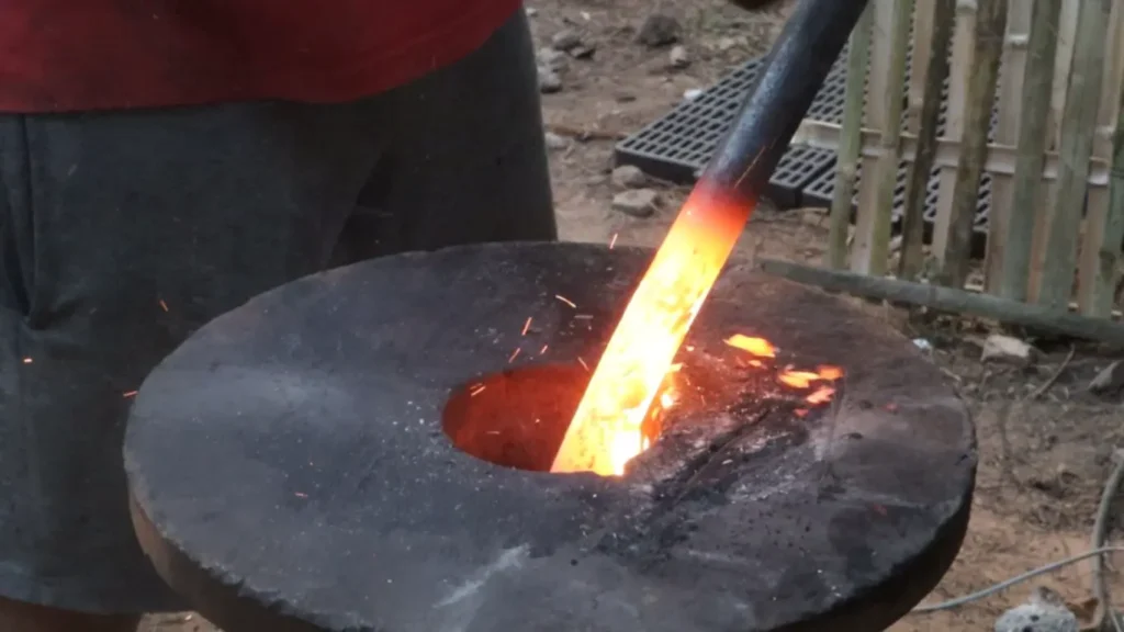 3.การลงค้อนต้องทุบและค่อย ๆ หมุนมือตามไปด้วย เพื่อให้ค้อนสัมผัสกับผิวชิ้นงานได้สม่ำเสมอ ซึ่งเป้าหมายในการตีครั้งแรก คือการตีไล่ให้ปลายทั่งมีความเรียวไล่ระดับเป็นทรงกรวยจึงจะสามารถสอดคอดาบเข้าไปตีขยายได้นั่นเองค่ะ