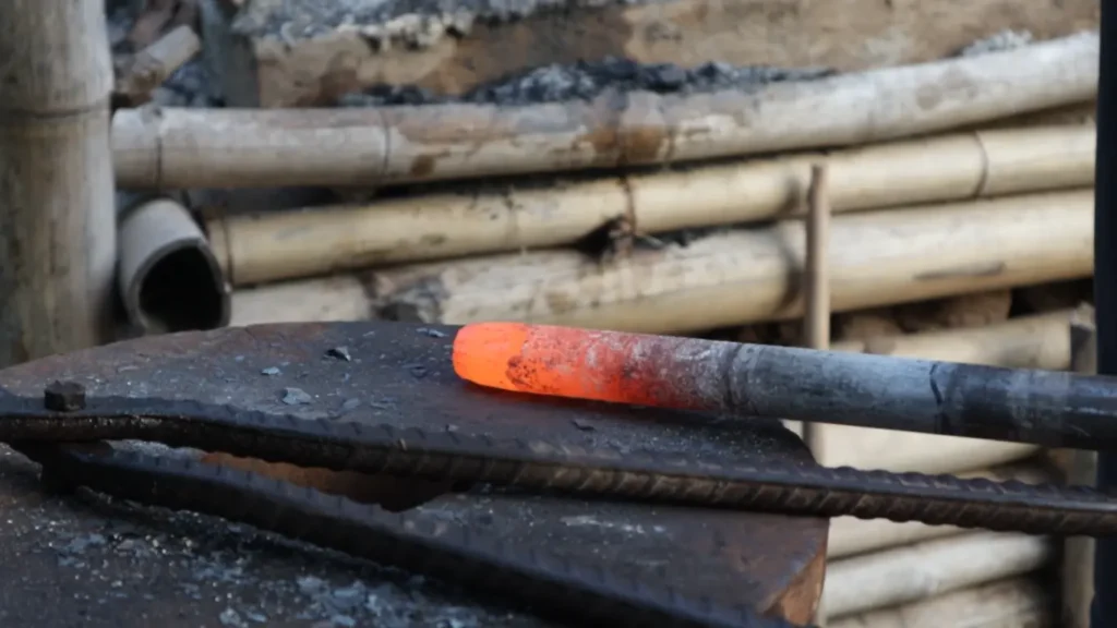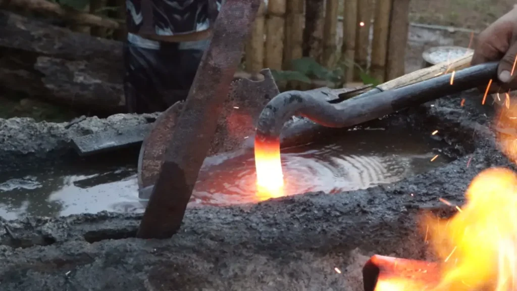 8.พอสีเหล็กเริ่มแดงก่ำก็หยุดความร้อนด้วยการนำไปชุบน้ำเปล่า แต่ถ้าบริเวณปลายมีการยู่ลง ก็อย่าลืมตีแต่งเพื่อให้คืนทรงเดิม