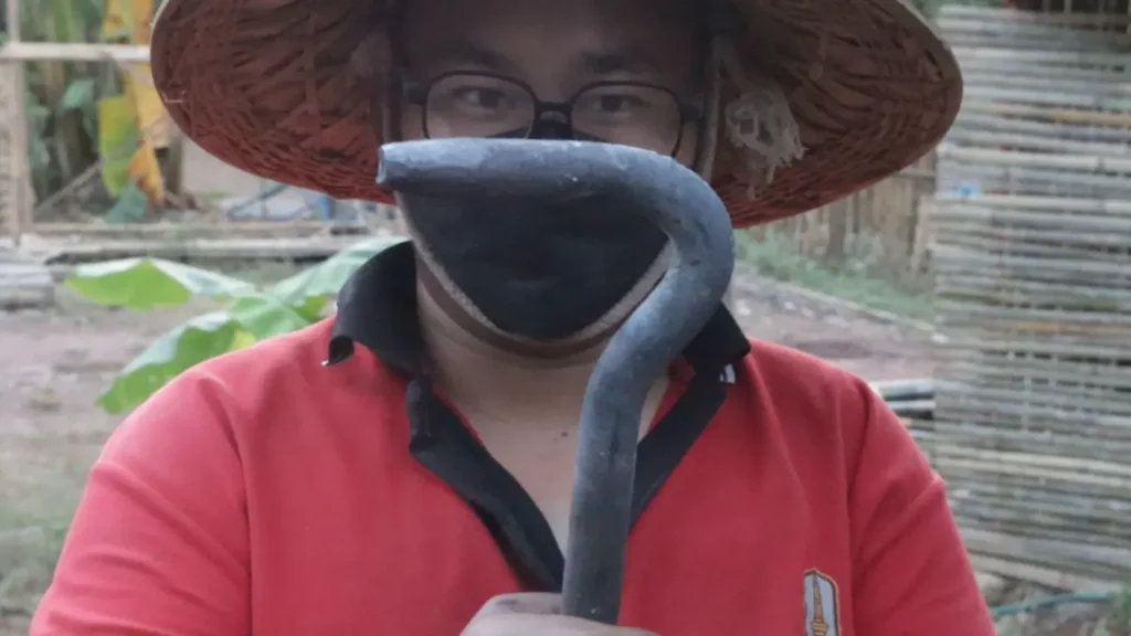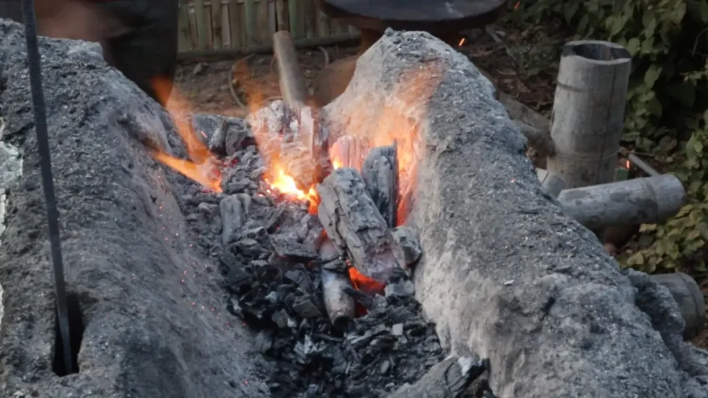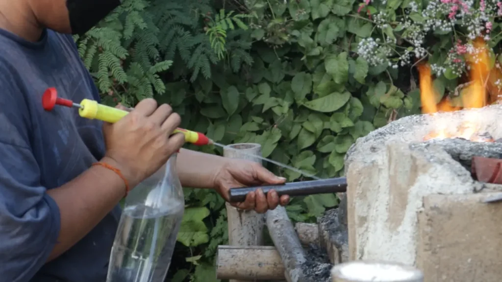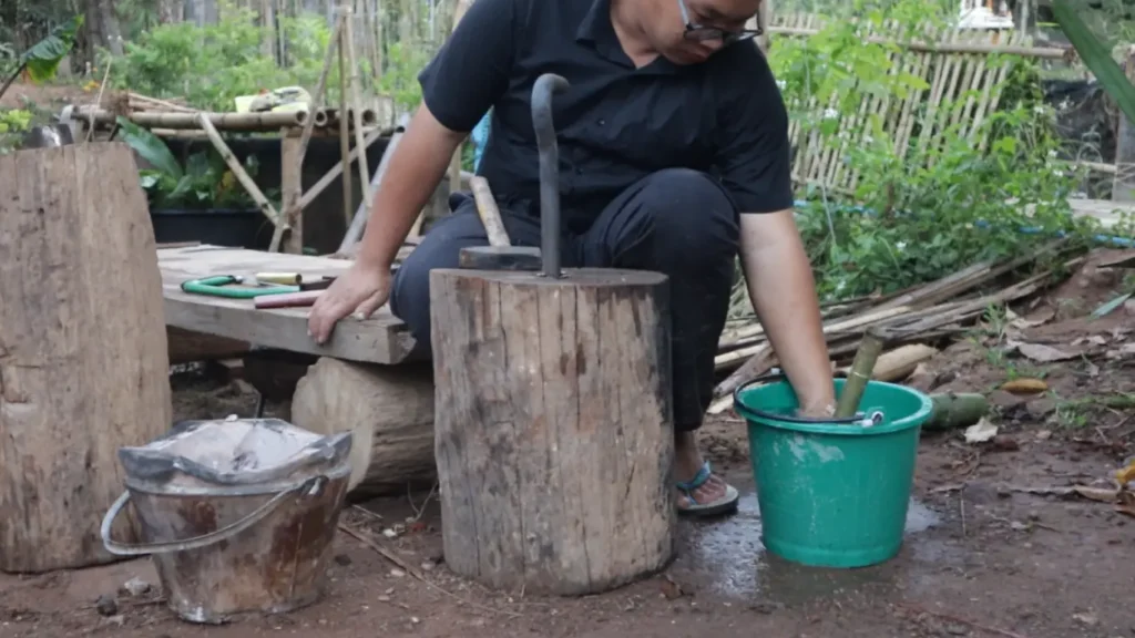 2.ท่อนเหล็กที่จะใช้ทำทั่งนี้มีสัณฐานกลม แล้วบังเอิญว่าคีมคีบของเราก็ประยุกต์จากคีมปอกมะพร้าวธรรมดาๆ ไม่อาจคีบจับเหล็กได้มั่น ต้องใช้มือเปล่าในการจับเหล็กแทนคีมคีบในบางจังหวะ ด้วยเหตุนี้จึงต้องมีการหล่อเลี้ยงน้ำลดความร้อนอยู่ตลอดเวลา