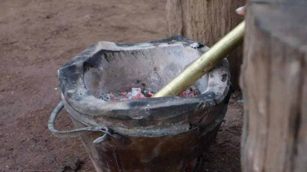 - เผาทองเหลือง ในการเผาทองเหลืองจะเผาด้วยไฟอ่อนๆ เพื่อให้ทองเหลืองอุ่นพอที่จะตีขยายได้ก็พอแล้ว หากเผานานเกินไปทองเหลืองก็จะละลายใช้การไม่ได้ค่ะ