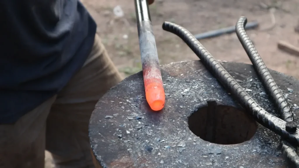 7.เมื่อเหล็กแดงแล้วก็ยัดลงในรูทั่ง (โมลด์ดัดเหล็ก) แล้วทุบเหนือบริเวณที่ถูกเผา แต่ถ้าใครมีประแจดัดเหล็กก็จะใช้วิธีการดัดคล้ายกับการดัดเหล็กโครงสร้างซึ่งจะดัดให้เป็นฉากหักศอก