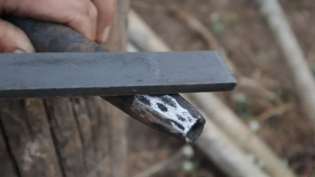 5.เมื่อตีปลายทั่งได้ทรงตามที่ต้องการแล้วก็ต้องมาขูดผิวด้วยตะไบ เหล็กชนิดนี้มีทั้งความแข็งและหนา จึงถือเป็นขั้นตอนที่ต้องใช้แรงและอาศัยระยะเวลาในการขัดไม่น้อยเลยล่ะค่ะ