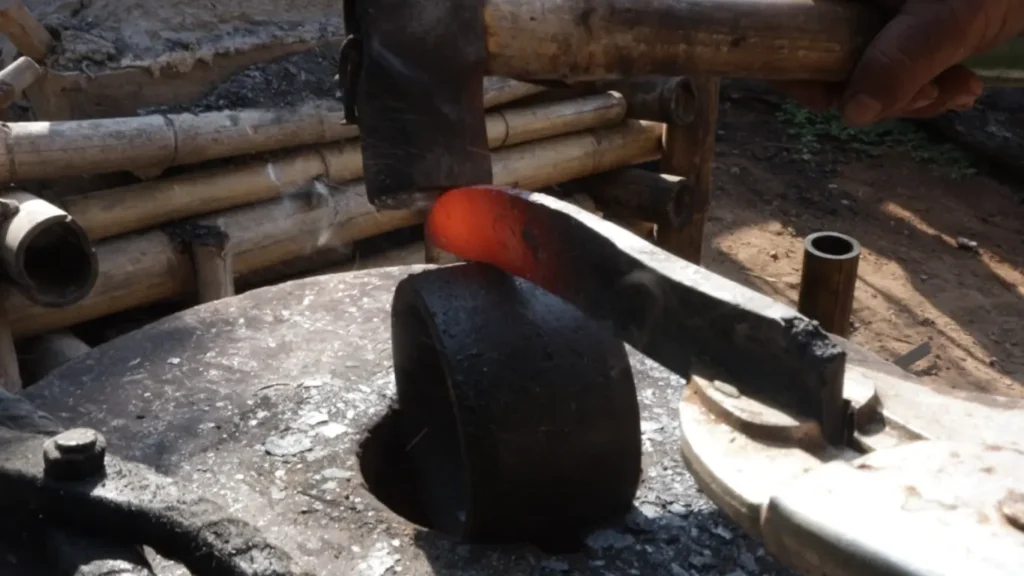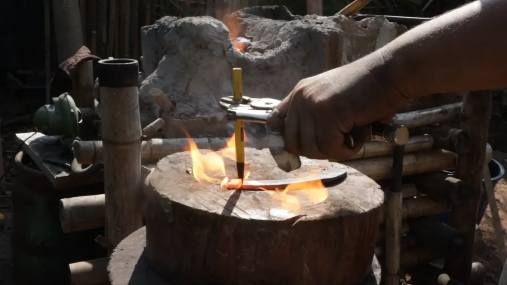 3.หากต้องการให้มีดโค้งตรงกลางใบ ก็เน้นเผาช่วงกลางใบแต่ตีดัดปลายเพื่อให้งุ้มลง โดยจะรองตีด้วยตลับลูกปืนอีกวง