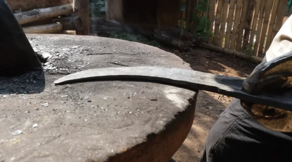 4.ครั้นพอมีดเริ่มโค้งก็ต้องตีท้องคมทั้งสองด้าน โดยวิธีนี้ก็จะทำให้มีเหยียดตรงขึ้นเล็กน้อยจากความโค้งเดิม ดังนั้น ก็ต้องเผาและดีดัดด้วยวิธีนี้สลับกันไปเรื่อย ๆ จนกว่าจะได้ทรงมีดเป็นจันทน์เสี้ยวตามที่ต้องการ