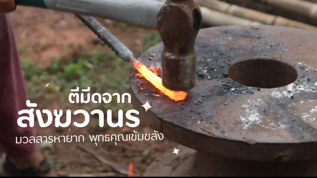 - เติมถ่านและเผาตะปูสังฆวานรให้แดงจัดจึงนำขึ้นมาตีนวดให้เป็นทรง