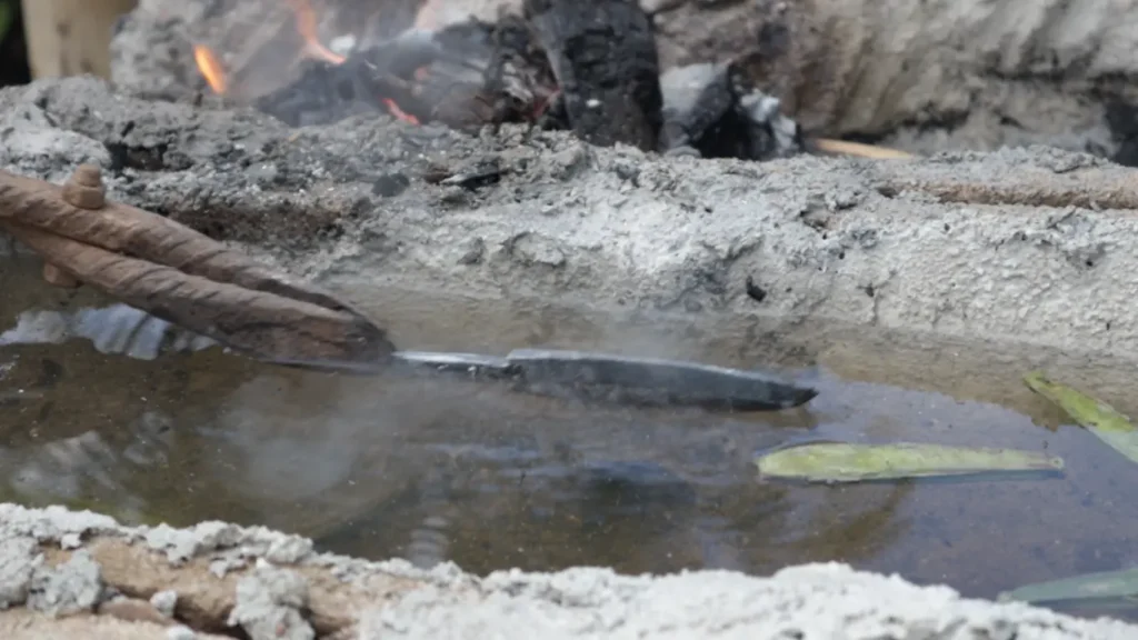 - เนื่องจากเป็นเหล็กผสมควรโรยผงบอแรกซ์เพื่อให้เหล็กผสานเป็นเนื้อเดียวกันก่อนเผา แต่ถ้าเป็นในอดีตก็จะใช้ดินอาถรรพ์ 7 ชนิด มาหุ้มเหล็กไว้