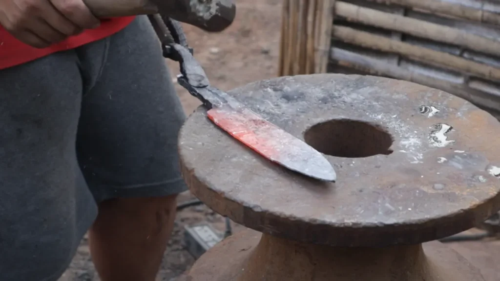 การตีแต่งทรงมีดเหมือนกันกับมีดไทย คือปั้นทรงให้ได้ตามที่ต้องการเสียก่อน จากนั้นจึงตีคมมีดให้เบี่ยงแค่ด้านเดียว ในขณะเดียวกันก็ต้องรักษาแนวระนาบอีกด้านของใบมีดด้วย ซึ่งพี่ช่างจะเอียงค้อนตี และถ้าจะให้ดีทั่งที่ใช้ควรเป็นทั่งหน้าเรียบค่ะ